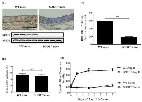 The efficiency of superoxide dismutase (SOD1) deletion and effect of AngII infusion on systolic blood pressure. (A) Immunohistochemistry (upper part) and Western blot analysis (lower part) of aortas from WT mice and SOD1−/− mice using anti-SOD1 antibodies. (Scale bars = 100 µm.) SOD activity in red blood cells (B) and serum (C). Red blood cells (RBCs) do not have mitochondria so SOD activity would be that of cytosol SOD (SOD1). (n = 22~26 per group. *** p < 0.001 n.s.: not significant). (D) Saline or AngII (3.2 mg/kg per day) was chronically infused using osmotic mini-pumps. Systolic blood pressure was measured by the tail-cuff method (n = 12 per group). Error bars represent SEM. WT: wild type; SOD1−/−: superoxide dismutase 1 deficient; AngII: angiotensin II.