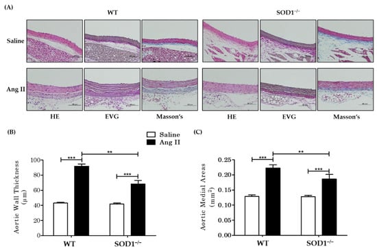 The collected aortas were subjected to HE staining, EVG staining, and Masson’s trichrome staining (Figure 2A) (Supplemental Figure S1). In the saline-treated group, no changes were observed in SOD1−/− mice compared to WT mice, while AngII-treated mice showed hypertrophy of vascular smooth muscle cells with associated thickening of the tunica media and thickening of the adventitia due to fibrosis. Nuclei were enlarged, nuclear staining by hematoxylin was weakened, and cytoplasmic vacuolation was observed, suggesting that cell death occurred. The above findings with AngII administration were more pronounced in WT but were attenuated in SOD1−/−. Quantitative analysis of aortic vessel wall thickness showed that Ang II-induced aortic wall thickening, which was observed in WT, was attenuated in SOD1−/− (Figure 2B,) (WT mice 91.9 ± 1.13 µm versus SOD1−/− mice 68.4 ± 1.41 µm p < 0.001). Vascular tunica media area was also weakened in SOD1−/− (WT mice 0.223 ± 0.0051 mm2 versus SOD1−/− mice 0.186 ± 0.004 mm2 p = 0.001) (Figure 2C).