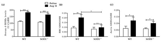 Extracellular and intracellular H2O2 levels in blood and aortas in vivo. (A) Derivatives of reactive oxygen metabolites (d-ROMs), which detect hydro-peroxide (R–OOH), were measured as an extracellular H2O2 indicator (n = 12 per group. *** p < 0.001). (B) Oxidized glutathione (GSSG)/reduced glutathione (GSH) ratios were measured in RBCs as an indicator of intracellular H2O2 (n = 8 per group. * p < 0.05 ** p < 0.01 n.s.: not significant). (C) GSSG/GSH ratios in aortas (n = 10~11 per group. * p < 0.05). Error bars represent SEM. ROS: reactive oxygen species; WT: wild type; SOD1−/−: superoxide dismutase 1 deficient; Ang II: angiotensin II; d-ROMs: derivatives of reactive oxygen metabolites; RBC: red blood cell; GSSG: oxidized glutathione; GSH: reduced glutathione; DHE: Dihydroethidium.