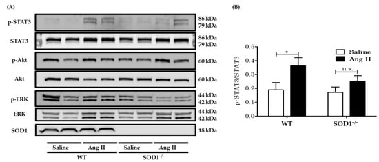 The protein expressions of aortas from WT and SOD1−/− mice with saline or AngII. (A) Representative results of Western blot analyses of phosphorylated STAT3, phosphorylated Akt, phosphorylated ERK1/2, and SOD1 in aortas from WT and SOD1−/− mice, with saline or AngII. (B) Quantitative analyses by densitometry of immunoblots expressed as ratios of phosphorylated STAT3 to STAT3. (n = 8 per group. * p < 0.05 n.s.: not significant) Error bars represent SEM. STAT3: signal transducer and activator of transcription 3; ERK: extracellular signal-regulated kinase.