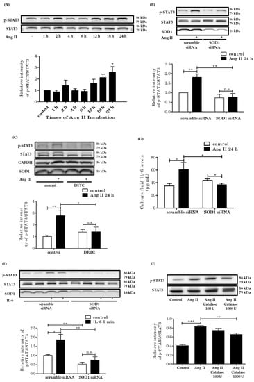 Rat vascular smooth muscle cells (VSMCs) incubated with AngII. (A) Time course of STAT3 phosphorylation of VSMCs due to AngII. VSMCs were stimulated with 100 nM AngII for the indicated times. The top panels are representative immunoblots for Ang II-induced phosphorylation of STAT3. The bottom panels represent averaged data quantified by densitometry of immunoblots, expressed as fold increases in phosphorylation, in which the phosphorylation for the control was defined as 1.0 (n = 4 per group. * p < 0.05) (B) The expression of phosphorylated STAT3 of VSMCs induced with AngII. The expression of SOD1 was downregulated with SOD1 siRNA (6 nM). The bottom panels represent quantification of densitometry, expressed as fold increases in phosphorylation, in which the phosphorylation for “scramble siRNA control’’ was defined as 1.0 (n = 7 per group. * p < 0.05 ** p < 0.01 n.s.: not significant). (C) The SOD1 activity was pharmacologically inhibited by 0.1 mM DETC (copper-chelating compound). DETC was added to VSMC culture fluid 4 h before AngII. The bottom panels represent averaged data quantified by densitometry of immunoblots (n = 9 per group. * p < 0.05 ** p < 0.01 n.s.: not significant). (D) The IL-6 levels in the culture fluid were analyzed by the ELISA test (n = 12–15 per group. * p < 0.05). (E) The expression of phosphorylated STAT3 of VSMCs induced with IL-5. The expression of SOD1 was downregulated with SOD1 siRNA (6 nM). The bottom panels represent quantification of densitometry, expressed as fold increases in phosphorylation, in which the phosphorylation for “scramble siRNA control’’ was defined as 1.0 (n = 7 per group. * p < 0.05 ** p < 0.01 n.s.: not significant) (F) The top panels are representative immunoblots of Ang II-induced phosphorylation of STAT3 in the presence and absence of PEG-catalase (100–1000 U). The bottom panels represent averaged data quantified by densitometry of immunoblots (n = 3 per group. ** p < 0.01 *** p < 0.001). Error bars represent SEM. Ang II: angiotensin II; STAT3: signal transducer and activator of transcription 3; GAPDH: glyceraldehyde-3-phosphate dehydrogenase; SOD1: superoxide dismutase 1; DETC: diethyldithiocarbamate; AngII: angiotensin II; PEG-catalase: polyethylene glycol-conjugated catalase.