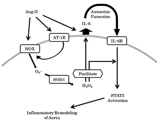 The cytosolic H2O2 produced by SOD1 facilitated IL-6 synthesis in VSMCs and its secretion from them, which had been induced by AngII. H2O2 facilitated the activation of STAT3 by IL-6. These mechanisms were responsible for the inflammatory remodeling of aortas. AT-1R: angiotensin II receptor 1; NOX: NADPH oxidase.