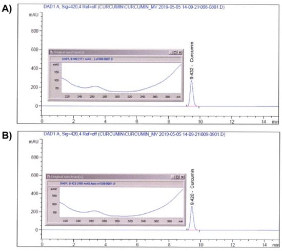 Identification of curcumin in CM-SD was performed by an Agilent 1100 Series high-performance liquid chromatography (HPLC) System (Agilent Technologies, Inc., Santa Clara, CA, USA) coupled with diode array detector. Curcumin was analyzed by a Capcell Pak® C18 column (4.6 × 250 mm, 5 μm; Shiseido Co., Ltd., Kyoto, Japan) at 40 °C. A mobile phase containing 0.1% (v/v) phosphoric acid (Samchun Chemicals Co., Ltd., Pyeongtaek-si, Gyeonggi-do, Republic of Korea) (A) and acetonitrile (HPLC grade; Burdick & Jackson, Charlotte, NC, USA) (B) was used with the following gradient: 0–15 min, 50% B. The sample injection volume was 10 μL with a flow rate of 1 mL/min. The UV wavelength was set at 420 nm. Curcumin standard (Sigma-Aldrich, St. Louis, MO, USA) and CM-SD were both dissolved in HPLC grade methanol (Daejung Chemicals & Materials, Siheung-si, Gyeonggi-do, Republic of Korea) for the analyses. The chromatograms of curcumin in standard chemical and CM-SD are shown in Figure 1A,B, respectively.