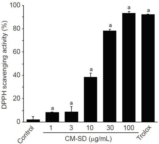 Antioxidant activity is regarded as one of the most important mechanisms for the regulation of degenerative loss of skeletal muscle. To investigate in vitro antioxidant capacity of CM-SD, the current study examined radical scavenging activity by DPPH assay. CM-SD increased radical scavenging activity in a dose-dependent manner, as shown in Figure 2. Relative radical scavenging activities by 1, 3, 10, 30, and 100 μg/mL of CM-SD were 8.19 ± 0.47%, 8.85 ± 4.49%, 35.25 ± 3.67%, 78.42 ± 1.02%, and 93.53 ± 1.38%, respectively. Radical scavenging activity by 100 μM of Trolox was 92.30 ± 0.17%. Significant differences in radical scavenging activity were observed in 1–100 μg/mL of CM-SD, and the level for 100 μg/mL of CM-SD was comparable to that by 100 μM of Trolox (p = 0.562 in LSD test).