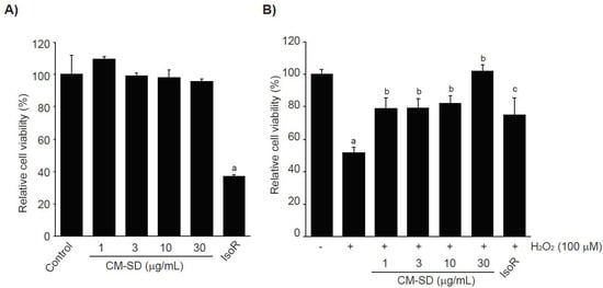 C2C12 cells were seeded at a density of 2 × 104 cells/well in a 96-well plate to determine the cytotoxicity activity of CM-SD. To examine the cytotoxicity of CM-SD, C2C12 cells were treated with 1–30 μg/mL of CM-SD for 24 h. To investigate the cytoprotective effects of CM-SD in C2C12 cells, 1–30 μg/mL of CM-SD were pre-incubated 1 h prior to the addition of 100 μM of hydrogen peroxide (H2O2; Sigma-Aldrich) for 6 h. Thirty micromolar of IsoR was used as a reference drug []. After incubation of the cells, viable cells were stained with 3-(4,5-dimethylthiazol-2-yl)-2,5-diphenyltetrazolium bromide (MTT, 0.1 μg/mL; Sigma-Aldrich) for 2 h, according to a previous study with some modifications []. The media were removed, and then the produced formazan crystals in each well were dissolved by 200 μL of DMSO. Absorbance was measured at 570 nm using an automatic microplate reader (BioTek Instruments, Inc.). Relative cell viabilities were calculated according to the following equation:
