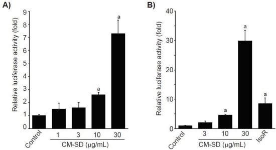 To determine the luciferase activity, recombinant HepG2 cells which express pGL4.37 were replated in 12-well plates (5 × 105 cells/well) overnight and exposed to 1–30 μg/mL of CM-SD for 18 h, as previously described []. The relative luciferase activity was calculated as the relative change to protein content measured by the bicinchoninic acid method. To investigate Nrf2 transactivation in C2C12 cells, reporter gene assay was carried out as previously established []. Briefly, C2C12 cells were plated at a density of 5 × 104 cells per well in a 12-well plate and allowed to grow overnight. The cells were co-transfected with 500 ng of pGL4.37 and 100 ng of pRL-TK (Renilla luciferase expression plasmid under an HSV-thymidine kinase promoter) for 6 h in the presence of FuGENE® HD transfection reagent (Promega), and then exposed to 3–30 μg/mL of CM-SD for 18 h. Thirty micromolar of IsoR was used as a reference drug []. The luminescence intensity of treated cell lysates was measured using Dual-Luciferase Reporter Assay System and GloMax® 20/20 Luminometer (Promega). The luminescence intensity of firefly luciferase was divided by that of Renilla luciferase to calculate the relative luciferase activity.