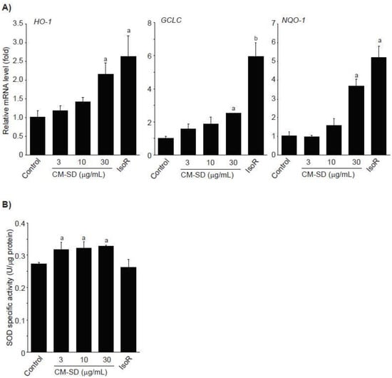Activated Nrf2 binds to ARE and enhances transcription of antioxidant genes such as heme oxygenase (HO)-1, glutamate cysteine ligase catalytic subunit (GCLC), NADH-dependent quinone oxidoreductase (NQO)-1, and SOD [,]. To examine whether Nrf2 activation by CM-SD increases activities of antioxidant genes, C2C12 cells were treated with 3–30 μg/mL of CM-SD for 12 h, and then monitored mRNA levels of antioxidant genes by real-time PCR analysis. Results from real-time PCR analysis indicate that treatment with CM-SD tended to increase mRNA levels of HO-1, GCLC, and NQO-1, while induction of antioxidant genes treated by 30 μg/mL of CM-SD was only statistically significant as compared with control cells. As expected, IsoR (30 μM) significantly increased the mRNA levels of HO-1, GCLC, and NQO-1 (Figure 5A). Relative HO-1 mRNA levels treated with 3 μg/mL CM-SD, 10 μg/mL CM-SD, 30 μg/mL CM-SD, and 30 μM IsoR were 1.19 ± 0.12, 1.41 ± 0.12, 2.16 ± 0.31, and 2.64 ± 0.56 folds of control cells, respectively. Relative GCLC mRNA levels treated with 3 μg/mL CM-SD, 10 μg/mL CM-SD, 30 μg/mL CM-SD, and 30 μM IsoR were 1.57 ± 0.31, 1.88 ± 0.38, 2.51 ± 0.02, and 5.94 ± 0.88 folds of control cells, respectively. Relative NQO-1 mRNA levels treated with 3 μg/mL CM-SD, 10 μg/mL CM-SD, 30 μg/mL CM-SD, and 30 μM IsoR were 0.96 ± 0.09, 1.58 ± 0.36, 3.69 ± 0.38, and 5.22 ± 0.60 folds of control cells, respectively. When C2C12 cells were treated with either 3–30 μg/mL of CM-SD or 30 μM of IsoR for 24 h, SOD activities in cell homogenates were marginally, but significantly increased by three different dosages of CM-SD. However, IsoR had no effect on SOD activity (Figure 5B). Specific activities of SOD in control, 3 μg/mL CM-SD-, 10 μg/mL CM-SD-, 30 μg/mL CM-SD-, and 30 μM IsoR-treated cells were 0.27 ± 0.005, 0.32 ± 0.02, 0.32 ± 0.02, 0.33 ± 0.003, and 0.26 ± 0.24 U/μg of protein, respectively.