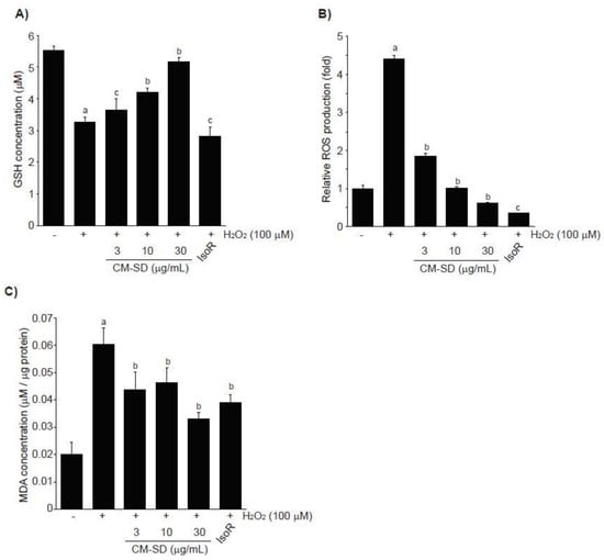 C2C12 cells were pretreated with either 3–30 μg/mL of CM-SD or 30 μM of IsoR for 1 h, and subsequently exposed to 100 μM of H2O2 for 12 h. After treatment, the cells were lysed by a radioimmunoprecipitation assay buffer containing 1 mM sodium fluoride, 1 mM β-glycerophosphate, 1 mM sodium orthovanadate, 2.5 mM sodium pyrophosphate, and protease inhibitor cocktail (GenDEPOT, Barker, TX, USA) for 1 h on ice and centrifuged at 15,000× g for 10 min. MDA levels in the resulting lysates (approximately 250 μg of protein lysates) were assayed according to the manufacturer’s instruction (TBARS Assay Kit; Cayman Chemical, Ann Arbor, MI, USA). The absorbance of the sample was monitored at 530 nm using a microplate reader (BioTek Instruments, Inc.), and the concentration of MDA was determined from a standard curve.