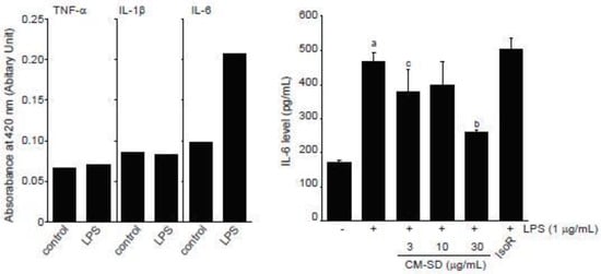 LPS is endotoxin of gram-negative bacteria that binds to toll-like receptor (TLR) 4 and activates an acute inflammatory response in myoblast as well as immune cells [,]. When C2C12 cells were exposed to 1 μg/mL of LPS for 12 h, our preliminary experiments by ELISA showed that IL-6, but not TNF-α and IL-1β, increased in conditioned medium obtained from LPS-treated C2C12 cells (Figure 7, left). To examine the effect of CM-SD on LPS-mediated proinflammatory cytokines production, C2C12 cells were pretreated with either 3–30 μg/mL of CM-SD or 30 μM of IsoR for 1 h, subsequently exposed to 1 μg/mL of LPS for 12 h, and then the IL-6 production in culture medium was determined. When compared to the control, treatment with LPS (1 μg/mL) significantly increased the production of IL-6. Pretreatment of CM-SD significantly decreased LPS-inducible IL-6 production. However, IsoR pretreatment did not inhibit IL-6 production by LPS (Figure 7, right). IL-6 levels in control, LPS alone, LPS + 3 μg/mL CM-SD-, LPS + 10 μg/mL CM-SD-, LPS + 30 μg/mL CM-SD-, and LPS + 30 μM IsoR-treated cells were 171.43 ± 6.23, 468.10 ± 27.86, 380.95 ± 62.14, 400.48 ± 64.81, 259.05 ± 7.87, and 502.38 ± 33.57 pg/mL, respectively.