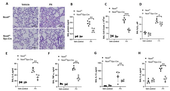 All experimental procedures were approved by the Institutional Animal Care Committee of the University of Illinois at Chicago (UIC). Nox4f/f mice used in this study were described previously [], and tamoxifen-inducible Spc-Cre mice (Sftpc-CreERT2) were obtained from Jackson Laboratories (Bar Harbor, ME, USA). The mice were bred at the UIC BRL facility and were maintained in a barrier facility with free access to food and water. Both male and female mice, 8 weeks old, were used. Tamoxifen-inducible Nox4−/− mice (Nox4f/f-Spc-Cre+/− mice) were produced by crossing Nox4f/f mice with Spc-Cre+/+ mice. Breeding was carried out by crossing Nox4f/f mice with Nox4f/f-Spc-Cre+/+, with a 50% yield of Nox4f/f-Spc-Cre-negative and Nox4f/f-Spc-Cre+/− animals. Genetic deletion of Nox4 in Nox4f/f-Spc-Cre+/− mice was induced by intraperitoneal (i.p.) injection of tamoxifen (200 mg/kg dissolved in autoclaved corn oil) for 5 consecutive days and used for experiments 15 days later. Nox4f/f mice serving as controls also received the same dosage of tamoxifen via i.p. injection for 5 consecutive days and were experimented 15 days post-tamoxifen injection. Mice were anesthetized with ketamine (100 mg/kg), xylazine (5 mg/kg), and intratracheally administered 20 μL of PBS or live PA103 (1 × 106 CFU/mouse) prepared in 20 μL of PBS as described [,]. Dorsal sub-cutaneous (s.c.) injection of buprenorphine (0.1 mg/kg) was applied for post-operative analgesia. After 24 h of treatment, bronchoalveolar lavage (BAL) fluids were collected using 1 mL of sterile Hanks Balanced Salt Buffer. Cytokines in the BAL fluids were measured using enzyme-linked immuno-absorbent assay (ELISA), and H2O2 by Amplex Red Hydrogen Peroxide/Peroxidase kit (Invitrogen, Carlsbad, CA, USA). Left lungs were removed and fixed with 10% formalin, and paraffin-embedded 5 μm thick sections were stained with hematoxylin and eosin for immunohistochemistry. Right lung was snap-frozen in liquid nitrogen and stored at −80 °C for the preparation of total lysates and Western blot analysis.