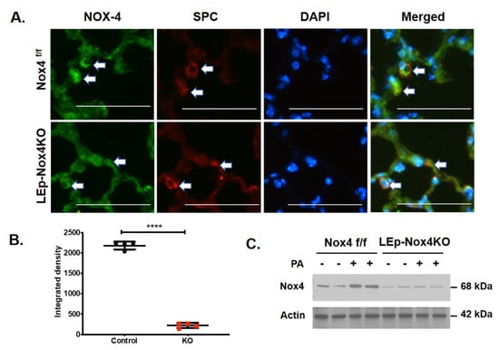 NADPH Oxidase 4 (NOX4) expression is downregulated in lungs and isolated alveolar epithelial cells from LEp-Nox4 knock out (KO) mice. (A) Lungs from tamoxifen-treated Nox4flox/flox and LEp-Nox4 knock out (KO) mice were removed, fixed, and embedded in paraffin, as described under experimental procedures. Cut 5 µm lung sections were subjected to immunofluorescence staining for NAPH Oxidase 4 (NOX4) (green), surfactant protein C (SPC) (red), and nuclear staining with 4′,6-diamidino-2-phenylindole (DAPI) (blue). Shown is a representative micrograph of co-localization of NOX4 and SPC (merge of green and red) with the alveolar type 2 pneumocytes indicated with arrows. Co-localization of NOX4 (green) and SPC (red) seen in lungs of Nox4flox/flox mice, but not in LEp-Nox4-deficient mice. The white triangular arrows highlight the NOX4-SPC colocalized areas in the image. Shown is a representative micrograph, Scale bar, 100 µm. (B) Quantification of merged images of NOX4 (green) and SPC (red) of the micrographs from (A). **** p < 0.005. (C) Nox4flox/flox and LEp-Nox4 KO mice (n = 5) were challenged intratracheally with sterile PBS or P. aeruginosa (PA) (1 × 106 CFU/mouse) for 24 h as indicated in Figure 1. Lungs were lavaged, and lung tissue lysates (30 µg protein) were subjected to sodium dodecyl sulfate-polyacrylamide (SDS-PAGE) and Western blotting, and immunostained for NOX4 and actin using specific antibodies. Shown is a representative blot from three independent experiments.