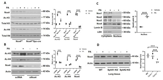 Earlier, we have demonstrated a role for SPHK2, but not SPHK1, in P. aeruginosa-mediated H3 and H4 histone acetylation in the mouse lung and HBEpCs []. Further, as the S1P signaling seems to modulate cellular ROS generation in lung cells, we investigated whether sphingosine kinase-regulated NOX4 expression plays a role in histone acetylation, in the mouse lung. Infection of mouse lung with P. aeruginosa increased NOX4 expression in WT and Sphk1−/− mice; however, there was no robust increase in the expression of NOX4 in the lungs of Sphk2−/− mice exposed to P. aeruginosa (Figure 3D). Together, these results show nuclear localization of NOX4 and its upregulation in the nucleus, and knockdown of Nox4 reduced P. aeruginosa-mediated H3 and H4 histone acetylation in lung epithelial cells.