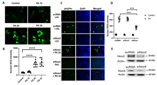 NOX4, but not NOX2, mediates nuclear ROS generation in lung epithelial cells challenged by P. aeruginosa. (A) Mouse lung epithelial (MLE) 12 cells grown in 35 mm glass-bottom dishes (~90% confluence) were transfected with scrambled or nuclear reactive oxygen species (ROS) biosensor nuclear-HyPer plasmid (50 nM) for 48 h before exposure to heat-inactivated P. aeruginosa (PA) (1 × 108 CFU/mL). Nuclear ROS (hydrogen peroxide) production was monitored by live imaging of cells at varying time periods using confocal microscope. Shown is a representative micrograph depicting the green biosensor after PA treatment from three independent experiments. (B) Nuclear ROS from (A) were quantified by Image J and presented as intensity (at least 20 cells were chosen from each field and minimum of 3–5 different fields from each dish for analysis). Value are means ± SD from three independent experiments. **** p < 0.001. (C) MLE12 cells grown to ~70% confluence in 35 mm glass-bottom dishes were transfected with scrambled, Nox2, or Nox4 siRNA (50 nM) for 48 h followed by transfection with nuclear-Hyper plasmid as indicated in (A) for 24 h. Cells were challenged with heat-inactivated PA (1 × 108 CFU/mL) for 3 h, and production of ROS (hydrogen peroxide) in nucleus was monitored by live imaging (ROS, green; nucleus, DAPI) using a confocal microscope. (D) Nuclear ROS production was quantified by Image J and presented as intensity, at least 20 cells from each field and 3–5 fields from each dish were analyzed. Value are means ± SD from three independent experiments. *** p < 0.005. (E) Cell lysates (20 µg protein) from control, Nox2, and Nox4 siRNA-treated cells were subjected to Western blotting to confirm knock down of Nox2 and Nox4 after treatment with specific siRNA compared to scrambled siRNA treated cells. Representative blot is shown.