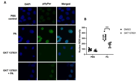 NOX4 inhibitor, Setanaxib (GKT 137831), attenuates P. aeruginosa-induced nuclear ROS in lung epithelial cells. Mouse lung epithelial (MLE12) cells grown in 35 mm glass-bottom dishes (~90% confluence) were transfected with control or nuclear-HyPer plasmid (50 nM) for 24 h. Cells were pretreated with NOX4/NOX1 inhibitor, Setanaxib (GKT 137831) (5 µM), for 1 h followed by heat-inactivated P. aeruginosa (PA) (1 × 108 CFU/mL) challenge for 3 h. Nuclear ROS (hydrogen peroxide) production was detected by live imaging of cells using a confocal microscope (A) and quantified by NIH Image J software (B) Shown is a representative image from three independent experiments, and values are means ± SD from three independent experiments. ** p < 0.001.