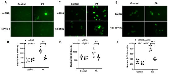 We have shown earlier that activation of PKC δ by P. aeruginosa induced SPHK2 phosphorylation and translocation to the nucleus with increased S1P generation, H3/H4 histone acetylation, and IL-6 secretion in the lung epithelial cells []. As P. aeruginosa challenge stimulated the nuclear H2O2 production via nuclear NOX4, we determined the role of PKC δ and SPHK2 in nuclear H2O2 generation. Knockdown of Pkc δ or Sphk2 with siRNA in MLE12 epithelial cells transfected with the nuclear HyPer significantly reduced nuclear H2O2 production stimulated by P. aeruginosa (Figure 6A–D). Similarly, inhibition of SPHK2 with ABC294640 [,] also attenuated the nuclear H2O2 generation (>80%) compared to cells not treated with the SPHK2 inhibitor (Figure 6E,F). These results show the critical requirement of PKC δ and SPHK2 in the NOX4-dependent nuclear H2O2 production in lung epithelial cells.