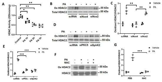 Having demonstrated a role for PKC δ and SPHK2 in the nuclear NOX4-induced H2O2 production, next we investigated whether nuclear H2O2 generated by P. aeruginosa inhibited HDAC activity and enhanced protein oxidation of HDAC2. Primary HBEpCs were challenged with heat-inactivated P. aeruginosa for 1–3 h and HDAC activity was determined in the nuclear fraction. As shown in Figure 7A, P. aeruginosa exposure to HBEpCs inhibited HDAC1/2 activity in the nuclear fraction, in a time-dependent manner. To determine if nuclear H2O2 facilitated oxidation of HDAC1/2, cells were transfected with scrambled, Pkc δ, SphK2, Nox4, or Nox2 siRNA (100 nM, 48 h). The cells were then exposed to P. aeruginosa for 3 h, and cell lysates were immunoprecipitated with anti-HDAC1/2 antibody and oxidation of carbonyl groups was detected by Western blotting with the OxyBlot protein oxidation detection kit. As shown in Figure 7B–E, P. aeruginosa exposure enhanced the oxidation of carbonyl groups in HDAC2, which was attenuated in cells wherein Nox4, PKC δ, and Sphk2 were downregulated by specific siRNA, but not Nox2 siRNA. Similarly, pretreatment of cells with N-acetyl-L-cysteine, an antioxidant, reduced the P. aeruginosa-mediated HDAC2 oxidation (Figure 7F–G). These results demonstrate that the nuclear H2O2 enhances HDAC2 protein oxidation that is dependent on PKC δ, SPHK2, and NOX4 in lung bronchial epithelial cells.