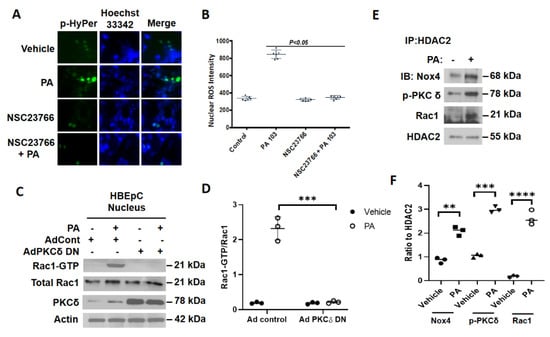 Having shown a potential role for RAC1 in nuclear ROS production by P. aeruginosa, next we investigated the potential association between NOX4, PKC δ, and RAC1 with HDAC1/2 in the nucleus. HBEpCs were treated with the heat-inactivated P. aeruginosa for 3 h, following which the cell lysates were immunoprecipitated with the anti-HDAC2 antibody and immunoblotted. As shown in Figure 8E,F, P. aeruginosa enhanced the association of HDAC2 with NOX4, p-PKC δ, and RAC1, suggesting a potential role for this complex in the nuclear ROS generation.