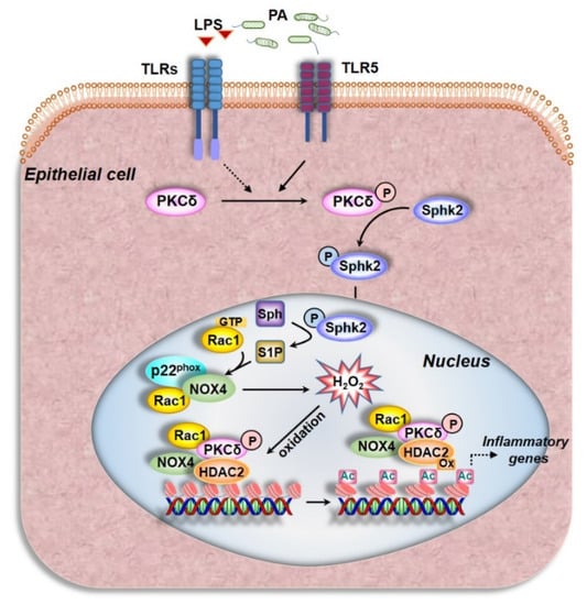 There is overwhelming evidence for intracellular ROS to play a pivotal role in signal transduction under normal physiology and induce oxidative stress in various human pathologies. Among the various sources of ROS, the NOX1–5 family has been shown to be involved in a wide variety of physiological and pathophysiological processes. While NOX1, 2, 3, and 5 generate superoxide, NOX4 produces predominantly hydrogen peroxide (H2O2), and is localized both in the cytosolic compartment and nucleus of the lung epithelial cell. Our findings collectively show a novel role for PA-induced PKC δ→SPHK2→RAC1→NOX4 activation and nuclear ROS generation. Further, the nuclear ROS modulates H3 and H4 histone acetylation and chromatin remodeling by inhibiting HDAC1/2 activity via oxidation and regulates secretion of pro-inflammatory cytokines in the lung epithelium (Figure 9). Thus, NOX4 could be a potential therapeutic target in mitigating bacterial and other lung inflammatory injury.