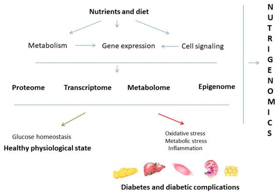 Environmental influences and nutritional intake are very much responsible for development of different diseases as two main factors that might affect health of an individual. To solve a complex interplay between environmental influences, nutrition and human health, the scientific field of nutrigenomics has started to develop. The last decade of nutrigenomics development provided evidence of the impact of nutrients and bioactive food compounds on gene expression and gene regulation, protein expression, epigenetic alterations, and metabolite changes. By understanding the interaction between genome, proteome, and metabolome with nutrients and bioactive food components, nutrigenomics connects nutrition and human health in order to classify dietary compounds with beneficial or injury effects [1]. In line with that, it was shown that diet is an important component that influences the onset of diabetes and development of its complications (Figure 1).