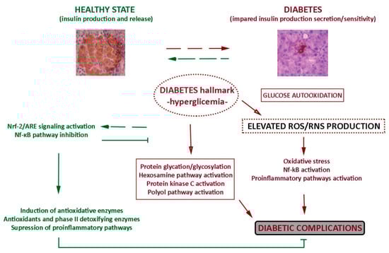Hyperglycemia, oxidative stress, and diabetic complications. Hyperglycaemia and glucose autooxidation are the main sources of free radicals in diabetic condition. Hyperglycaemia contributes to pathogenesis of diabetes, not only by free radical generation, but also through protein glycation and glycosylation, augmented metabolism of glucose through the hexosamine pathway, increased activation of the polyol pathway by unused glucose, glucose-mediated activation of protein kinase C. Under normal circumstances the concentration of ROS is modulated by antioxidant enzymes, antioxidants, and phase II detoxifying enzymes. Those cellular antioxidant defense systems are regulated by a master regulator Nrf-2, as well as by NF-κB. Nrf-2 (nuclear factor erythroid 2-related factor 2), NF-κB (nuclear factor kappa B), ARE (antioxidant response element). Immunohistological images of insulin (brown) present in pancreatic islets are taken from Mihailović et al., “Protective Effects of the Mushroom Lactarius deterrimus Extract on Systemic Oxidative Stress and Pancreatic Islets in Streptozotocin-Induced Diabetic Rats”, Journal of Diabetes Research, ID 576726, 10 pages, 2015. https://doi.org/10.1155/2015/576726 (accessed on 5 March 2021).