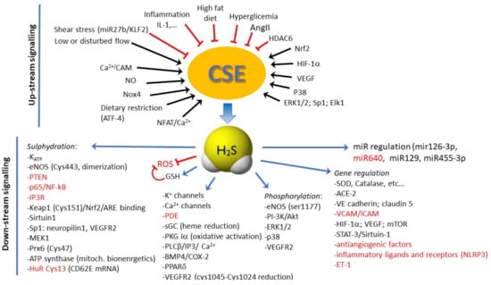 Summary of the molecular mechanisms controlling CSE expression and function in endothelial cells (up-stream signaling) and of the multiple downstream signaling activated or inhibited by H2S in ECs. Red target or lines means inhibition. Note that some signals are both up- and downstream, strengthening the central role of CSE/H2S in controlling vascular trophism and functions. ACE-2, angiotensin converting enzyme 2; Akt, protein kinase B; AngII, angiotensin II; ARE, antioxidant responsive elements; ATF4, activating transcription factor 4; BMP4, bone morphogenetic protein 4; cGMP, cyclic guanosine monophosphate; COX-2, cyclooxygenase-2; CSE, cystathionine γ-lyase; Elk1, ETS Like-1 protein; eNOS, endothelial NO synthase; ERK1/2, extracellular signaling regulated kinase ½; ET-1, endothelin-1; HIF-1a, hypoxia inducible factor-1a; HuR, human antigen R; ICAM, intercellular adhesion molecule; IL-1, interleukin 1; IP3, inositol-3-phosphate; IP3R, inositol-3-phosphate receptor; KATP, ATP-sensitive K+ channels; Keap1, Kelch-like ECH associated protein 1, KLF2, Krüppel-like Factor 2; MAPK, mitogen-activated protein kinase; MEK1, MAP kinase kinase 1; NFAT, nuclear factor of activated T-cells; NF-κB, nuclear factor-kappa B; NLRP3, nucleotide-binding oligomerization domain, leucine rich repeat, and pyrin domain containing protein 3; NO, nitric oxide; Nox4, NADPH oxidase 4; Nrf2, nuclear factor erythroid 2-related factor 2; p38, p38 mitogen-activated protein kinases; PDE, phosphodiesterase; PI-3K, phosphoinositide 3-kinase; PKG, protein kinase G; PLCβ, phospholipase Cβ; PPARδ, peroxisome proliferators-activated receptor δ; Prx6, thioredoxin-dependent peroxiredoxin; PTEN, phosphatase and tensin homolog; sGC, soluble guanylate cyclase; SOD, superoxide dismutase; Sp1, specificity protein 1 transcription factor; STAT3, signal transducer and activator of transcription 3; VCAM, vascular cell adhesion molecule; VEGF, vascular endothelial growth factor; VEGFR2, vascular endothelial growth factor receptor 2.
