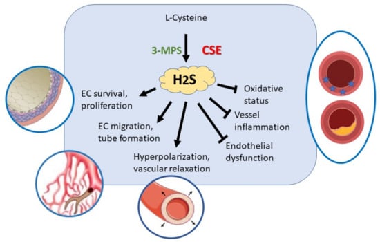 H2S in ECs performs a protective action on vessels in an autocrine/paracrine manner. It plays a role in the regulation of vasodilation, angiogenesis, inflammation, oxidative stress and apoptosis [59]. Three are the main mechanisms through which H2S exerts it biological effect: (i) reactive oxygen species/nitrogen species scavenging; (ii) interaction with metal centers; (iii) persulfidation (called also S-sulfhydration).