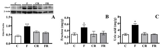 Hippocampus fructose handling. (A) Glut-5 level (with representative Western blot), (B) fructose and (C) uric acid concentrations in the hippocampi of control (C), fructose-fed (F), control rescued (CR), and fructose-rescued (FR) rats. Data are the means ± SEM of eight rats/group. * p < 0.05 versus control rats; *** p < 0.001 versus control rats. Source of variation: one-way ANOVA followed by Tukey’s post-test.