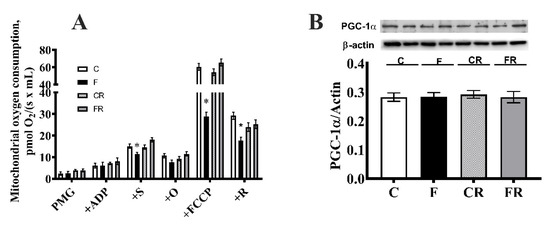 Mitochondrial function. (A) Non-normalized respiration after the addition of pyruvate + malate+ glutamate (PMG), ADP, succinate (S), oligomycin (O), FCCP, and rotenone (R), (B) PGC-1alpha concentration (with representative Western blot) in the hippocampi from control (C), fructose-fed (F), control-rescued (CR), and fructose-rescued (FR) rats. Values are the means ± SEM of eigth different rats. * p < 0.05, compared to C rats (One-way ANOVA followed by Tukey’s post-test). Data are the means ± SEM of eight different rats. * p < 0.05 compared to C rats. Source of variation: one-way ANOVA followed by Tukey’s post-test. FCCP: carbonyl cyanide p-trifluoromethoxyphenylhydrazone.