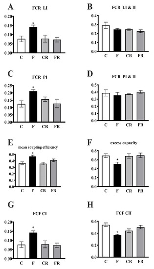 The FCRLI, FCRPI, and coupling efficiency significantly increased in F rats (Figure 5A,C,E), while the excess capacity was significantly lower (Figure 5F). In addition, the FCF was significantly higher for complex I, while the FCF for complex II was significantly lower (Figure 5G,H). All of the above changes were completely reversed in FR rats.