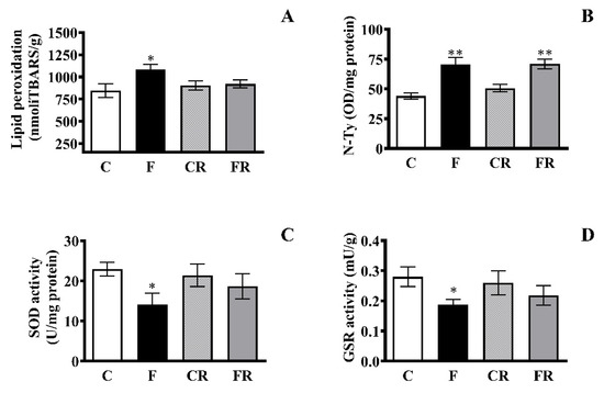 Markers of oxidative status. (A) TBARS (B) N-Tyr levels, (C) SOD activity, (D), GSR activity in the hippocampi of control (C), fructose-fed (F), control rescued (CR), and fructose-rescued (FR) rats. Data are the means ± SEM of eight rats/group. * p < 0.05 versus control rats; ** p < 0.01 versus control rats. Source of variation: one-way ANOVA followed by Tukey’s post-test.