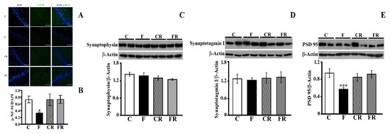 Markers of neuronal functioning. (A,B) p-Neurofilament M immunofluorescence (C) synapthophysin level (with representative Western blot), (D) synaptotagmin I (with representative Western blot), (E) PSD 95 level (with representative Western blot) in the hippocampi of control (C), fructose-fed (F), control rescued (CR), and fructose-rescued (FR) rats. Data are the means ± SEM of eight rats/group. * p < 0.05 versus control rats; *** p < 0.001 versus control rats. Source of variation: one-way ANOVA followed by Tukey post-test.