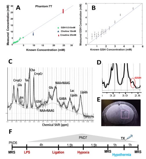 LCModel fitting of the spectra, evaluation of spectral quality, and quantification of metabolites were performed by a researcher blinded to the treatment group. To ensure good quality scans, the inclusion criteria for processed MRS were based on spectral quality as reported by the LCModel (full width at half maximum ≥ 0.1 ppm, signal to noise ratio ≥ 5) [] as well as for obvious artifacts due to gross motion and poor water suppression. Using explicit formulas for LCModel, a single water attenuation coefficient was calculated and implemented when processing all spectra. No partial volume correction was taken into account with these immature animals and we assumed brain matter uniformity. The following metabolites were analyzed for absolute concentrations in the right hemisphere: GSH, GLX, tCr, NAA, tCho, Tau, Ins and LAC. Major peaks for these metabolites are noted on a representative spectrum (Figure 1C,D). The inclusion of metabolite concentrations was based on Cramer Rao < 15% for all metabolites, excluding lactate. The range of Cramer Rao bounds for LAC is given in the results.