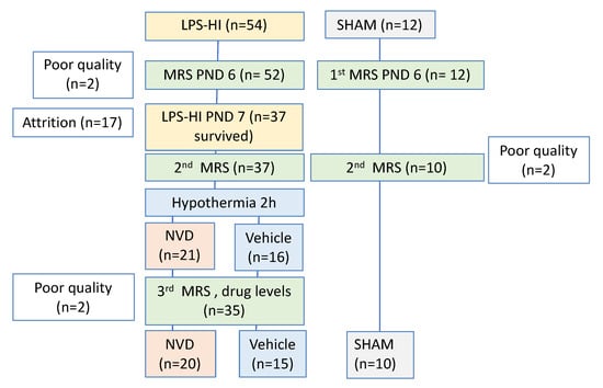 We randomized 66 rats (Figure 2) from 10 litters, and 17 rats died during or after the LPS-HI injury, before the third scan (10 males, 7 females). We obtained (1) pre-injury, baseline scans on PND 6 for 54 LPS-HI rats and 12 sham rats; (2) POST HI scans on 37 LPS-HI rats and 10 sham animals; and (3) POST HYPO scans on 20 NVD and 15 VEH animals. By sex, 23 females (n = 9 NVD, n = 6 VEH, n = 6 sham) and 21 males (n = 11 NVD, n = 9 VEH, n = 4 sham) survived to the final time point, with scans of sufficient quality for analysis. In total we analyzed 146 MRS scans (22 sham, 59 VEH and 65 NVD scans). The plasma volume was adequate for the determination of 1,25(OH)2D and 25(OH)D concentrations by radio-immunoassay in 20 animals (n = 12 LPS-HI, 8 sham) and NAC concentrations by HPLC in 13 animals (n = 10 NVD, 2 VEH, 1 sham).