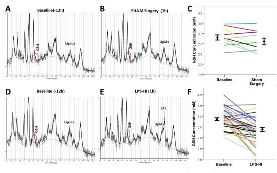 Representative spectra and change in GSH over time from sham (A–C) and LPS-HI rat pups (D–F). Lactate peaks are minimal in the sham animals before (A) and after sham surgery (B) and cannot be distinguished from lipid peaks in the MRS spectra. (C) Sham animals show no significant change in GSH before and after sham surgery (n = 10). (D,E ) Lactate peak increases significantly after LPS-HI injury and is clearly visible in spectra from a representative rat (E). (F) LPS-HI animals show a significant decrease in GSH concentrations after LPS-HI injury (p < 0.00017, n = 37). Group means and standard errors are noted. Table 1. LPS-HI effects on MRS metabolite concentrations (mM, mean, SE) from PRE (PND 6) to POST-HI (PND 7 sham, or after LPS-HI). p values are noted for pairwise comparisons by scan time within LPS-HI group by generalized linear mixed model (GLMM) with Bonferroni adjustments, controlling for sex. The number of adequate spectra for each metabolite varies depending on exclusion due to Cramer Rao bounds >15%.