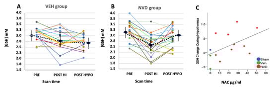 GSH concentrations in individual LPS-HI rats with adequate spectra for all 3 scans by VEH (A) or NVD (B) treatment over time and compared with NAC plasma concentrations (C). (A,B) Individual changes in GSH over serial scans at baseline (PRE), after LPS-HI (POST HI), and again immediately after 2 h of hypothermia (POST HYPO) in rats with VEH (A) or NVD (B) treatment. The markers show group mean and SE for each scan time. (A) The majority of VEH animals treated with saline do not show significant recovery with hypothermia alone and mean GSH continues to decrease at the third scan (n = 14). (B) In contrast, NVD treatment results in significant increases in mean GSH with hypothermia (n = 18). (C) Individual plasma NAC concentrations (n = 13) sampled immediately after last scan (POST HYPO) versus the change in GSH from immediately before and after NVD/saline. Sham concentration is included for reference.