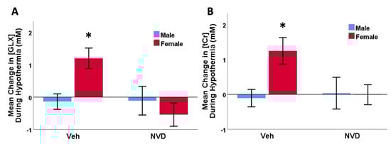 Changes in GLX (A) and tCr (B) between POST HI and POST HYPO scans by sex within treatment groups. VEH female animals (n = 6) showed a significant increase in mean GLX ((A), * p = 0.007), and Cr ((B), * p = 0.044) at 2.5 h after injury compared to VEH males (n = 9). There was no difference between females (n = 9) and males (n = 11) in the NVD group.