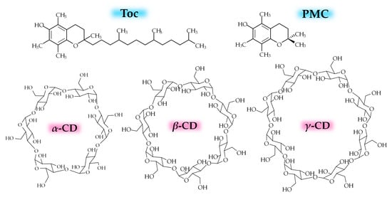 Toc (MW: 430.71), and PMC (MW: 220.31) were purchased from Fujifilm Wako Pure Chemical Industries, Ltd. (Osaka, Japan). α-CD, β-CD, and γ-CD were obtained from TCI Co. Ltd. (Tokyo, Japan). 2,2′-Azinobis (3-ethylbenzothiazoline-6-sulfonic acid ammonium salt) (ABTS) (>98%, MW: 548.67) was purchased from TCI Co. Ltd. (Tokyo, Japan).