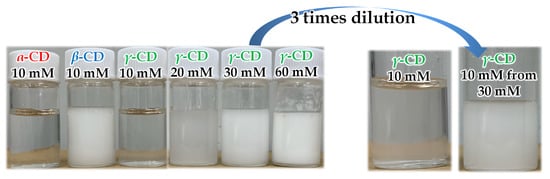 When stirring a water-soluble CD solution at 10 mM concentration with a water-insoluble vitamin E (Toc), an increase in turbidity was observed for each CD-added system, especially for the β-CD system (Figure 2). The dispersion for the β-CD system contained a large amount of Toc of about 2.6 mM, whereas the amounts of Toc stabilized by α-CD and γ-CD were negligible under the condition. However, in the case of γ-CD, the turbidity drastically increased with the initial concentration of γ-CD above 20 mM. The dispersions prepared with γ-CD concentrations above 20 mM were stable even after the dilution to 10 mM (Figure 2, right), whereas the dilution of the dispersion of β-CD system destabilized rapidly (i.e., the five times dilution of the β-CD system (10 mM) with a vortex mixing afforded a distinct agglomeration within 10 min). The results indicated the high stability of the dispersion formed in γ-CD-added systems.