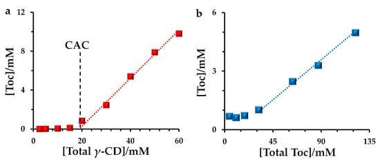 Figure 3a shows the unique concentration dependence of γ-CD. The amount of Toc suddenly increased above 20 mM γ-CD concentrations for I, suggesting that the concentration can be regarded as the critical aggregation concentration (CAC) to afford γ-CD/Toc-dispersions. As far as we know, the observation of CAC for CD/Toc systems was unprecedented. Furthermore, as shown in Figure 3b, the amount of contained Toc increased as the increase of the amount of total Toc was added for the preparation. However, most of the Toc remained in a phase-separated state for the preparation (Figure S1, Supplementary Materials), and only one-thirtieth of the Toc could be used. A nonlinear increase was observed in Figure 3b at the low Toc amount conditions, possibly owing to the adhesion problem of Toc on the surfaces of magnet and/or glass, respectively.