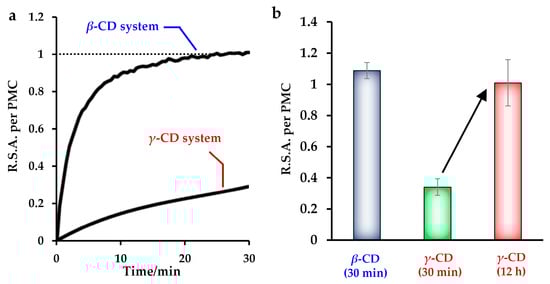 RSA was observed when Toc was contained in the sample. As shown in Figure 4a, CD–Toc dispersions prepared from 10 mM β-CD and 30 mM γ-CD aq showed effective RSA under diluted conditions. Noteworthy, while the 2,6-DMCD-added system showed no sustained effect in the previous study [], slight and large sustained effects were observed for the β-CD-added and γ-CD-added systems, respectively. This means that the dispersed Toc stabilized by β-CD and γ-CD, especially in the latter case, showed limited access owing to the hindered molecular diffusion of the self-assembled aggregates. Similar behavior was observed for sample II prepared using an inclusion solid consisting of γ-CD and Toc (Figure S7, Supplementary Materials).