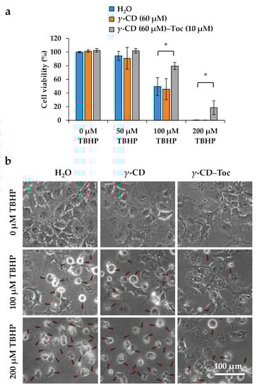 Cytoprotective impact of the γ-cyclodextrin (CD)-vitamin E (Toc) complex in the presence of a cytotoxic oxidative stressor. (a) Viability of COS-7 cells cultured for 30 min in the presence or absence of γ-CD or γ-CD-Toc before exposure to 0, 50, 100, or 200 µM tert-butyl hydroperoxide (TBHP) for 18 h. Cell viability was measured using a Cell Counting Kit-8 (Dojindo Laboratories) (* p < 0.05). (b) Phase-contrast photomicrographs of COS-7 cells cultured for 30 min in the presence or absence of γ-CD or γ-CD-Toc before exposure to 0, 100, or 200 µM TBHP for 18 h. The red arrowhead indicates a dead cell.