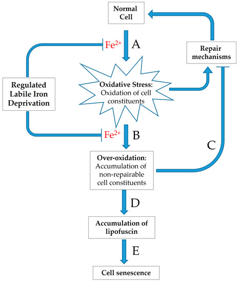 - Höhn, A.; Jung, T.; Grimm, S.; Grune, T. Lipofuscin-bound iron is a major intracellular source of oxidants: Role in senescent cells. Free Radic. Biol. Med. 2010, 48, 1100–1108. [Google Scholar] [CrossRef]