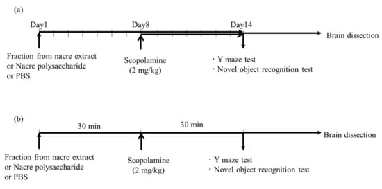 Schematic diagram of behavioral tests. (a) Mice were intraperitoneally injected with the nacre polysaccharide, nacre extract or PBS for 2 weeks. Scopolamine was injected for 1 week from day 8 to day 14, and behavioral tests were performed on day 14. (b) Experimental schedule of Y-maze test and novel object recognition test. One hour before conducting the behavioral tests, mice were intraperitoneally administered with a fraction of the nacre extract or PBS. After 30 min, memory impairment was induced by administering scopolamine (2 mg/kg), and the test was started 30 min later. The control group was administered with PBS only.