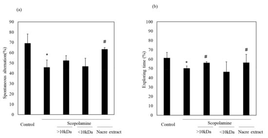 Effect of each fraction of >10 and <10 kDa on scopolamine-induced memory impairment. (a) Each fraction of the nacre extract and scopolamine was administered sequentially before conducting the behavioral tests: the Y-maze test (a) and novel object recognition test (b). Each fraction was injected at a dose of 5 mg/kg. Values are expressed as means ± SD. Significant difference between the groups: * p < 0.05, control versus scopolamine group; # p < 0.05, scopolamine group versus each fraction-treated group.