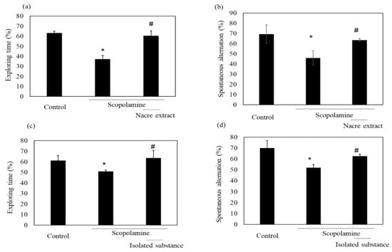 Comparison of the isolated substance and the nacre extract against scopolamine-induced memory impairment. The isolated substance of 50 μg/kg (c,d) or nacre extract of 50 mg/kg (a,b) and scopolamine were administered sequentially before conducting the behavioral tests, and spontaneous alternation (b,d) and relative exploring time (a,c) were determined. Values are expressed as means ± SD. Significant difference between the groups: * p < 0.05, control versus scopolamine group; # p < 0.05, scopolamine group versus nacre extract or isolated substance-treated group.