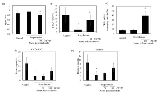 Effect of the nacre polysaccharide on oxidative stress in the cerebral cortex of scopolamine-treated mice. Lipid peroxidation (a) and antioxidant activities (Fe3+-reduction activity (b); DPPH radical scavenging activity (c)) in cerebral cortex of mice were determined. Expression levels of the antioxidant enzymes, Cu, Zn-SOD (d) and catalase (e), were examined by real-time PCR. The expression of each gene was normalized to the mean expression of GAPDH compared with the control values. Values are expressed as means ± SD. Statistical significance was determined using one-way analysis of variance with Tukey’s test. Significant difference between the groups: * p < 0.05, control versus scopolamine group; # p < 0.05, scopolamine group versus nacre polysaccharide group.