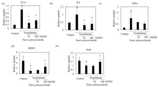 Effect of the nacre polysaccharide on the expression of genes associated with neuronal growth and inflammation in the cerebral cortex of scopolamine-treated mice. mRNA expression levels of IL-1β (a), IL-6 (b), TNF-α (c), BDNF (d) and NGF (e) were assessed by real-time PCR. The expression of each gene was normalized to the expression of GAPDH compared with control values. Values are expressed as means ± SD. Statistical significance was determined using one-way analysis of variance with Tukey’s test. Significant difference between the groups: * p < 0.05, control versus scopolamine group; # p < 0.05, scopolamine group versus nacre polysaccharide group.