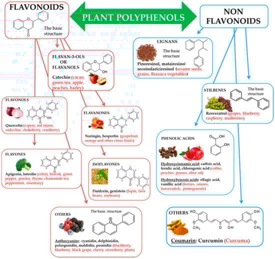 Polyphenols, subclasses, basic chemical structures, and representative polyphenolic-food sources (in red).
