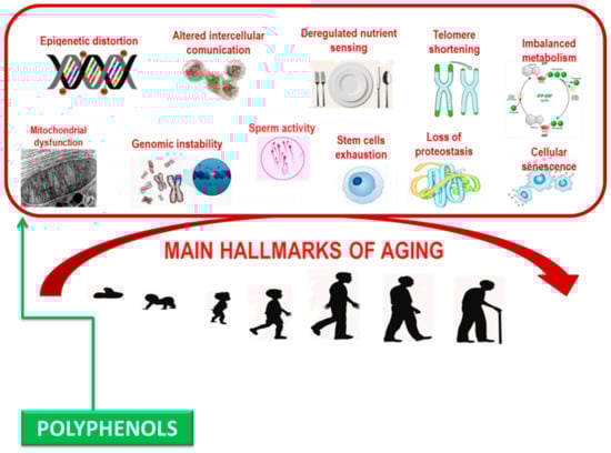 Over the past numerous decades, research in the biology of aging has attempted to discover “biomarkers” of aging. For example, telomere length has been a highly considered a biomarker of aging, as they shorten as individuals grow older. As proposed by Horvath’s efforts to use methylation markers as a biological clock [,], high-dimensional protein and/or metabolite profiles might emerge as ideal biomarkers of aging. Several studies suggest polyphenols as modulators of several of these aging indicators.