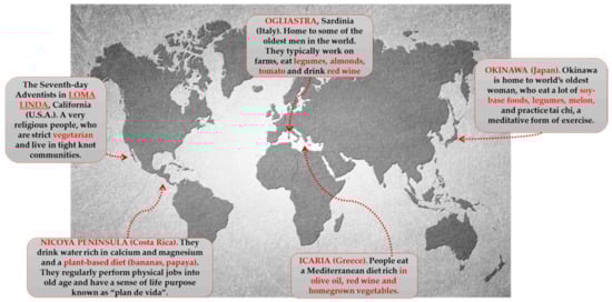 Blue zones (BZs) are mysterious areas that continue to fascinate research. They are precise zones in the world where life expectancy is booming—reaching levels far above anywhere else some parts of the world; according to researches, these regions are homes to many nonagenarians. The BZs have been identified in 2005 in an article in the National Geographic by respected journalist and author Dan Buettner [], they got their name because, when Buettner was researching these areas, he used blue circles around them on the world map. Although Buettner only talks about the five regions in his book, they may not be the only areas in the world that can be classified as BZs.